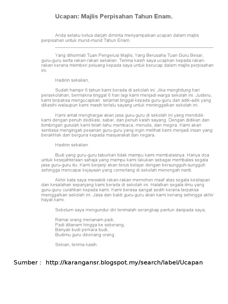 Teks Ucapan Pelajar Majlis Perpisahan Tahun 6 Pdf