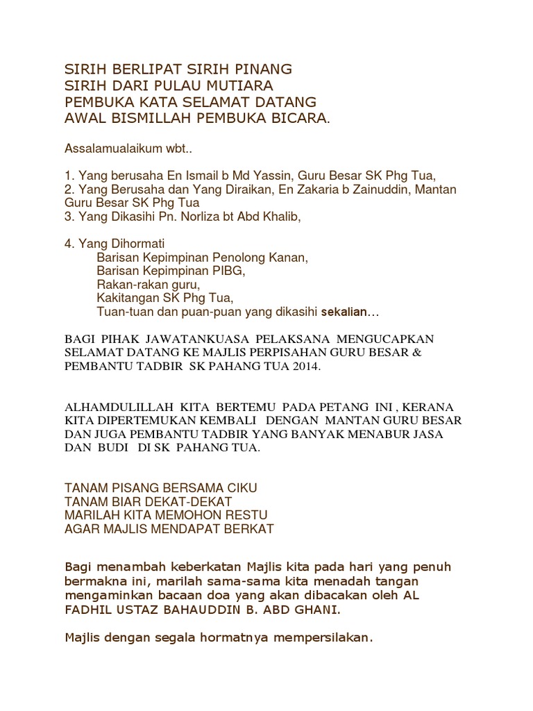 2 from Disampaikan semasa seseorang hendak berpisah sama ada berpindah tempat kerja berhenti kerja ataupun berakhirnya sesuatu projek. Teks ucapan majlis perpisahan persaraan yang berusaha dan dihormati 1. Cikgu mokhtar bin jaya guru besar sk abg moh.